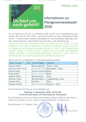 Für 10 Positionen im neu zu wählenden PGR wurden nur 8 KandidatInnen gefunden. Bis zum 26. Okt. 2025 – also zwei Wochen vor dem angesetzten Wahltermin – konnten keine weiteren Kandidatinnen und Kandidaten gefunden werden. Somit greift für unsere Pfarrei nun §12 Abs. 3 der Wahlordnung: