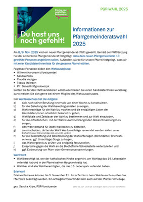 Am 8./9. Nov. 2025 wird ein neuer Pfarrgemeinderat (PGR) gewählt. Gemäß der PGR-Satzung hat der amtierende PGR festgelegt, dass dem neuen PGR zehn gewählte Personen angehören sollen. Außerdem wurde für unsere Pfarrei festgelegt, dass wir mit einer KandidatenInnenliste für die gesamte Pfarrei wählen. Folgende Personen bilden den Wahlausschuss: Wilhelm Hartmann (Vorsitzender), Sandra Krips, Claudia Veutgen, Tobias Moersen und Pfr. Benedikt Ogrodowczyk.