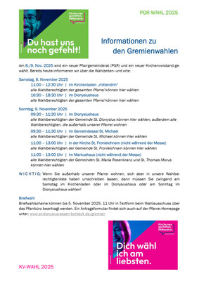 Am 8. & 9. November 2025 finden auch in unserer Pfarrei die Wahlen für den Kirchenvorstand und den Pfarrgemeinderat statt. Hier auf dieser Seite werden wir nach und nach Informationen dazu einstellen.