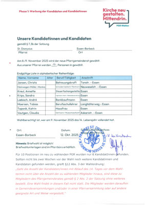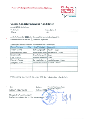 Der Wahlvorstand hat die Vorschlagsliste für die KV-Wahl veröffentlicht. Für die 12 Positionen im Kirchenvorstand wurden bisher 12 Kandidatinnen und Kandidaten gefunden. Die Vorschlagsliste kann auf Antrag von den Wahlberechtigten ergänzt werden. Der Antrag darf nicht mehr Namen enthalten, als Mitglieder zu wählen sind. Der Ergänzungsvorschlag ist gültig, wenn er von mindestens 10 Wahlberechtigten mit Vor-, Zunamen und Angabe des Erstwohnsitzes unterzeichnet und mit den notwendigen Erklärungen der Vorgeschlagenen gemäß § 9 Abs. 2 Wahlordnung für die Wahl der Kirchenvorstände in der Diözese Essen (KV-WO), innerhalb von zwei Wochen nach Beginn des Aushangs beim Wahlvorstand eingereicht ist.