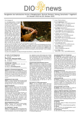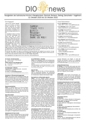 Hier stehen für sie die Pfarrnachrichten "DIOnews" zum Download und zur Ansicht bereit. Sie möchten die DIOnews wöchentlich per eMail zugeschickt bekommen? Kein Problem! Schicken sie uns einfach eine eMail an dionews@dionysius.de mit der Aufforderung zur Zusendung.